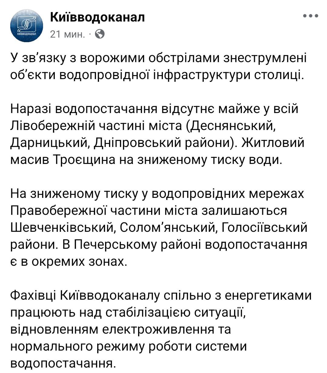 Левый берег столицы остался без водоснабжения. В Киевводоканале сообщили, что без водоснабжения остались Деснянский, Дарницкий и Днепровский районы. На Троещине, в Шевченковском, Соломенском и Голосеевском районах уменьшен напор воды. В Печерском районе вода есть только в отдельных зонах.