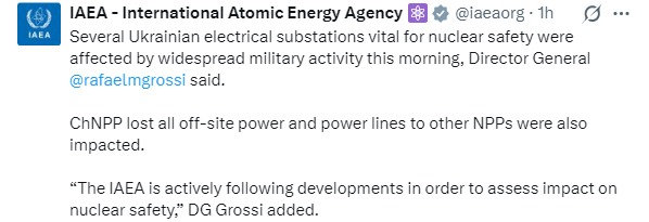 "Сегодня утром несколько украинских электроподстанций, имеющих решающее значение для ядерной безопасности, пострадали от масштабных военных действий, заявил генеральный директор Гросси. ЧАЭС полностью лишилась электроснабжения, а также пострадали линии электропередачи, ведущие к другим АЭС", - сказано в публикации.