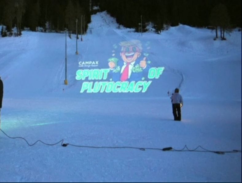 Между тем в Давосе проходят антитрамповские акции. Движение Campax спроецировало на горнолыжные склоны элитного курорта сатирическое изображение президента США с подписью "Дух плутократии" (плутократия - форма правления, при которой власть принадлежит богатым) и лозунг "Без королей" (No Kings, девиз протестов против Трампа, организованных в США демократами). В Campax заявили, что акция "символизирует разрыв между властью и обществом".