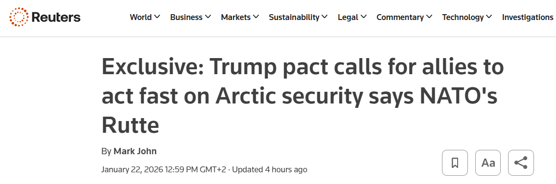 Напомним, накануне Трамп заявил, что с генеральным секретарем НАТО он уже сформировал рамки будущей сделки по Гренландии, а потому он не будет вводить пошлины против европейских стран.