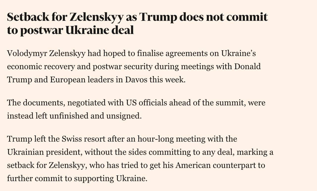 При этом указывается, что Трамп покинул Давос после часовой встречи, на которой так и не было достигнуто соглашение.