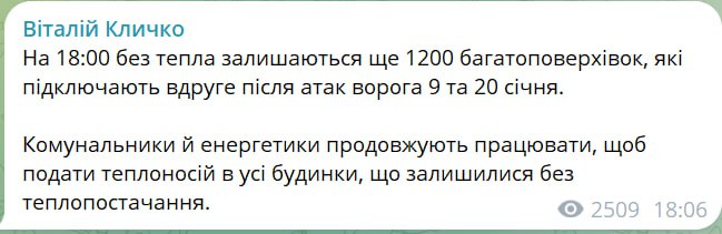 18:11 На 18:00 без тепла в Киеве остаются еще 1200 многоэтажек (из 11 тысяч), которые подключают второй раз после атак 9 и 20 января, сообщил мэр Кличко.