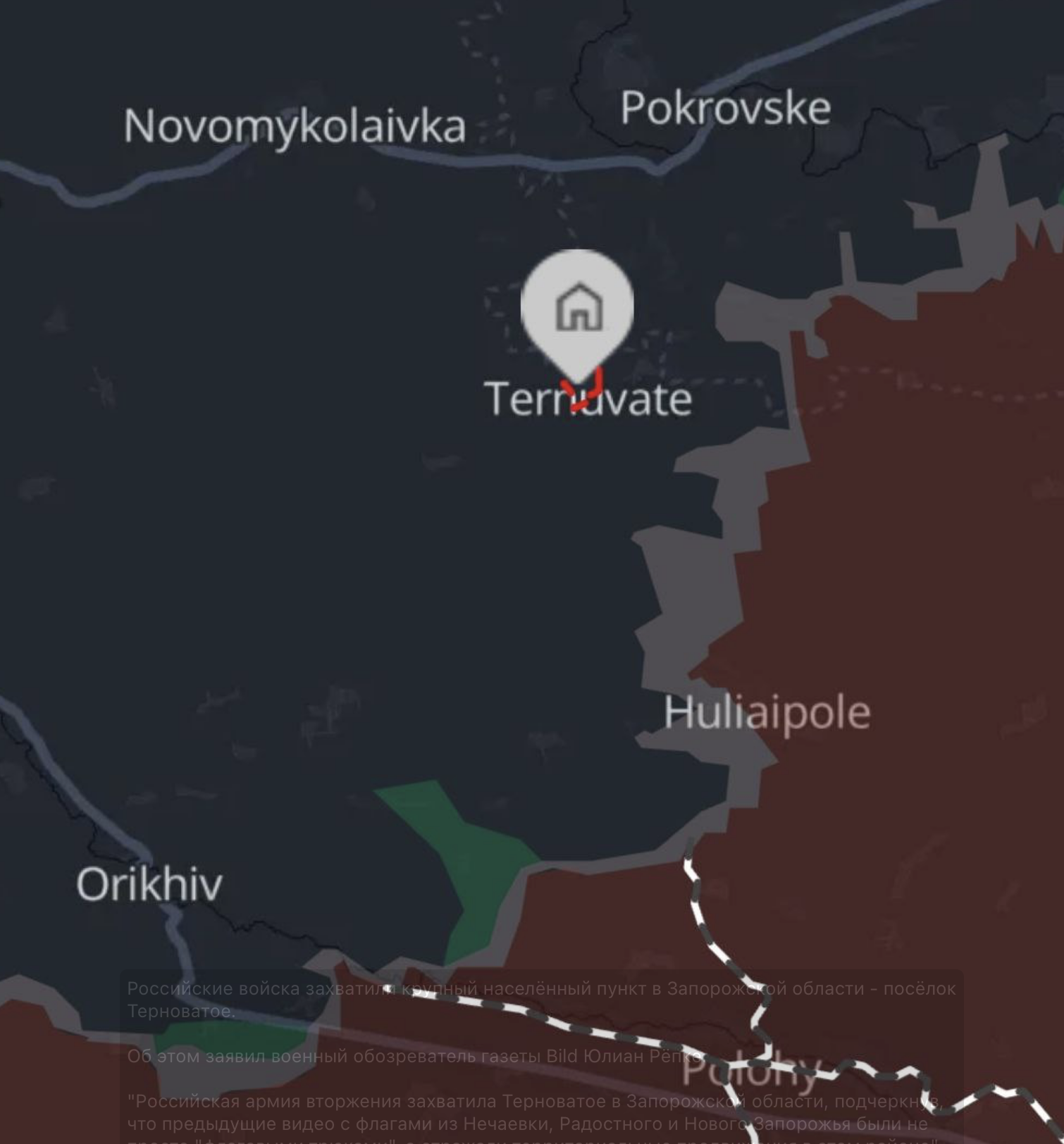 09:31 Российские войска захватили крупный населённый пункт в Запорожской области - посёлок Терноватое.