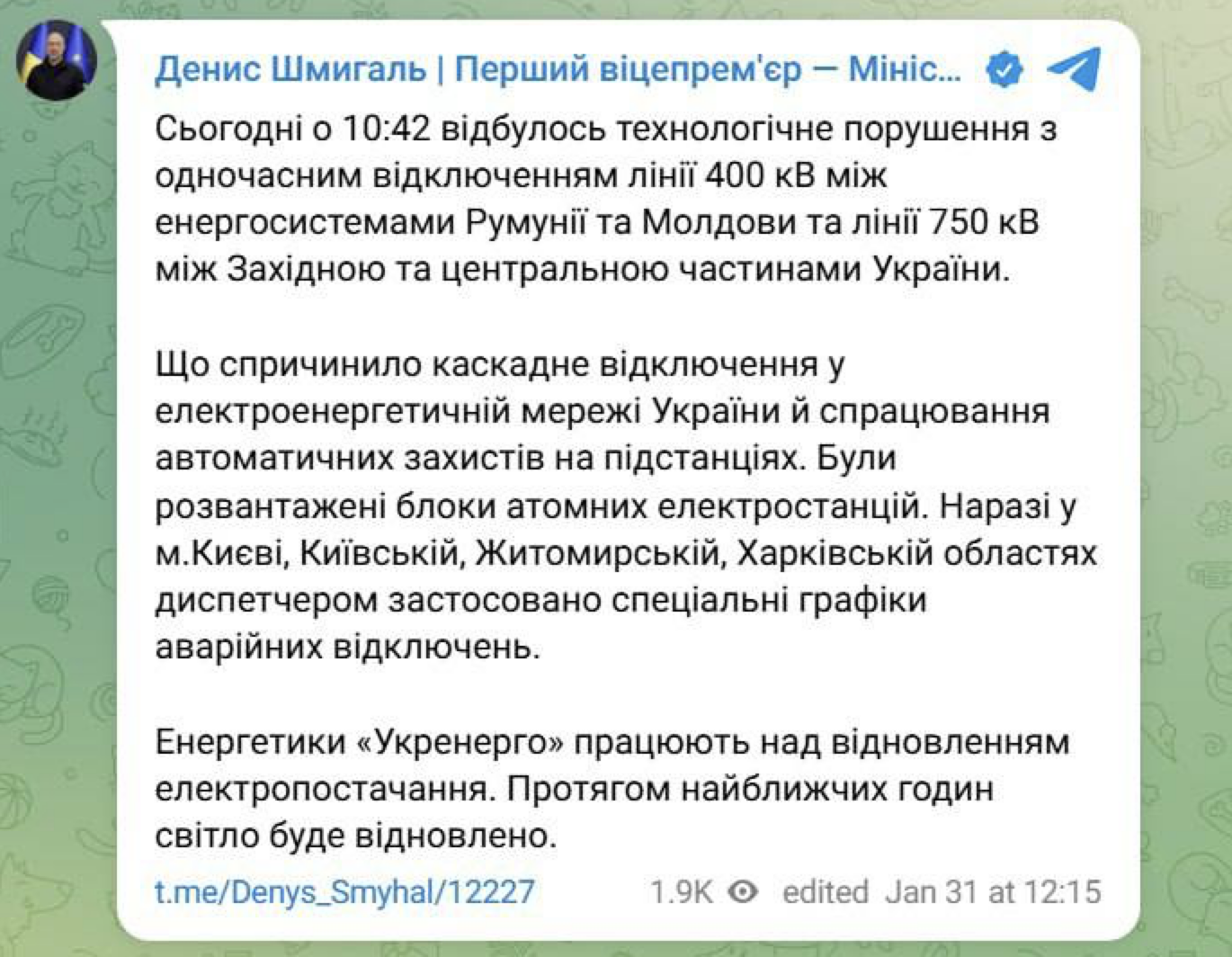 12:24 Первый официальный комментарий по сегодняшнему блекауту.