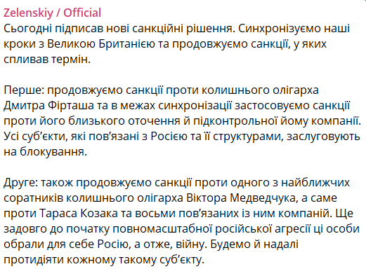 Также Зеленский написал, что эти санкции были введены в рамках "синхронизации шагов с Британией". Напомним, что британцы ввели санкции против Фирташа и его жены в ноябре 2024 года.