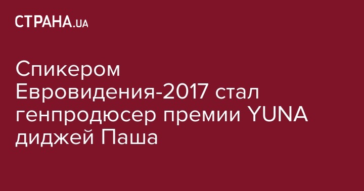 Спикером Евровидения-2017 от Украины станет ведущий радио и развлекательных мероприятий, генпродюсер музыкальной премии YUNA 2017 Павел Шилько, известный как DJ Паша. Об этом сообщили организаторы песенного конкурса, передает Укринформ.