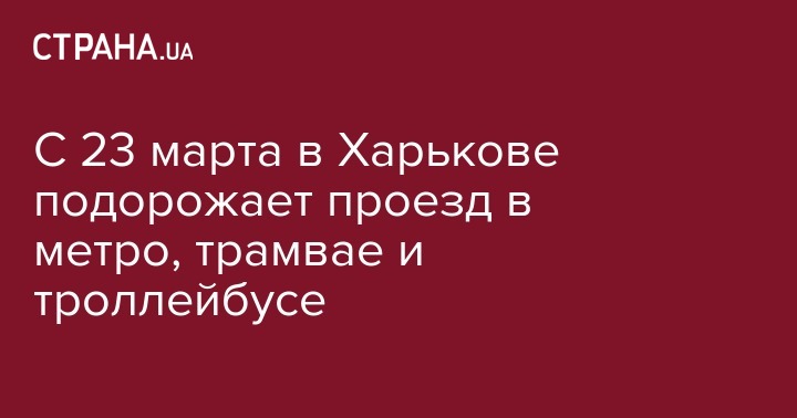 Исполнительный комитет Харьковского городского совета 22 марта принял решение о повышении стоимости проезда в метрополитене с 3 до 4 грн за поездку, в трамваях и троллейбусах - с 2,5 грн до 3 грн за поездку. Об этом сообщается на сайте горсовета.