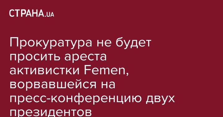 Прокуратура подает ходатайство об избрании активистке Femen Анджелине Диаш, которая обнажила грудь перед президентами Украины и Беларуси, меры пресечения в виде личного обязательства, а не ареста. Об этом сообщил ее адвокат Ярослав Яценко в Facebook.