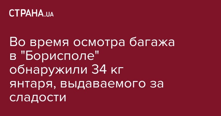 В Киевской области сотрудники СБУ и таможни выявили "воздушный" канал контрабанды янтаря за пределы Украины. Во время досмотра багажа в аэропорту "Борисполь" у двух иностранцев в аэропорту "Борисполь" (Киев) обнаружили 34 кг "солнечного камня".