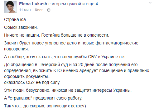 Адвокат Елена Лукаш в Facebook сообщила, что сегодняшний обыск в редакции "Страны" завершен. Во время него представители СБУ ничего не нашли.