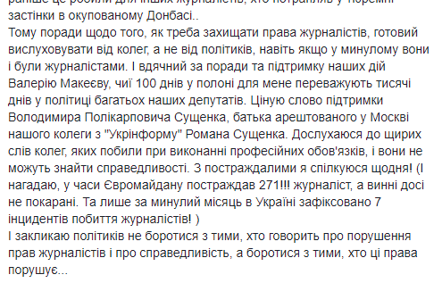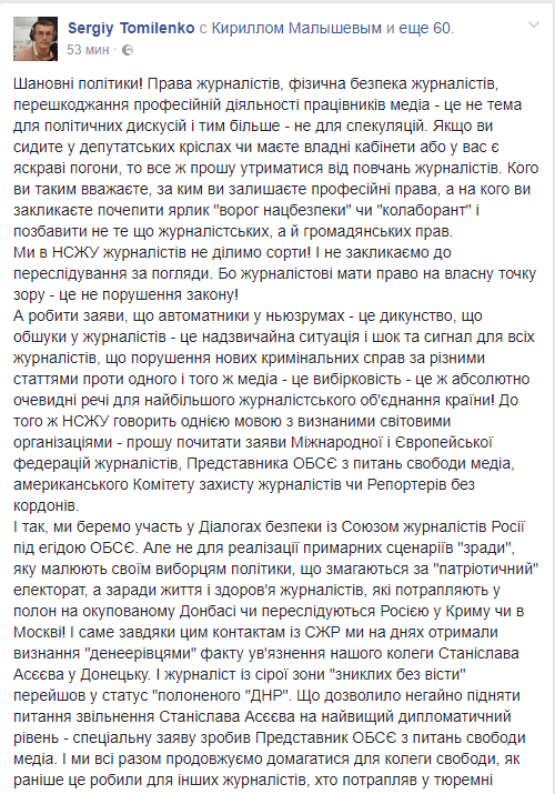 Председатель Национального союза журналистов Украины Сергей Томиленко выступил с заявлением в адрес украинских политиков, в котором пытается им объяснить, что преследование любых журналистов является цензурой и нарушением их прав. Большой пост этому он посвятил в Facebook.