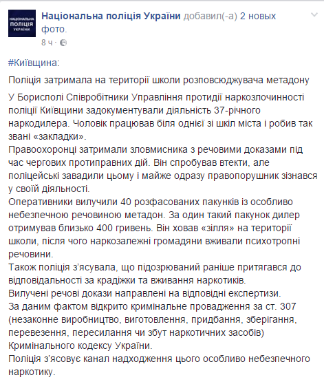 Отмечается, что оперативники изъяли 40 расфасованных пакетов с метадоном, за один такой пакет дилер получал около 400 гривен. По данным правоохранителей, подозреваемый прятал наркотики на территории школы. Также полиция выяснила, что подозреваемый ранее привлекался к ответственности за кражи и употребление наркотиков. Изъятые вещественные доказательства направили на экспертизы.