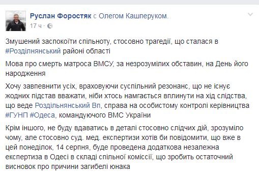 "Вынужден успокоить общественность по поводу трагедии в Раздельнянском районе области. Речь о смерти матроса ВМСУ, при непонятных обстоятельствах, в День его рождения", - написал Форостяк.
