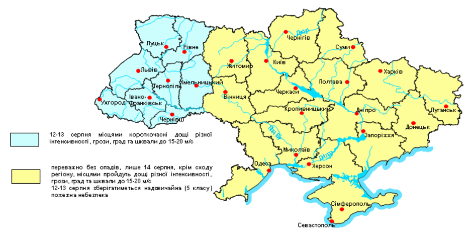 В воскресенье и понедельник 14 августа, в западных областях Украины ожидаются грозы, местами сильные ливни, град и шквалы, чья скорость будет достигать 17-22 м/с.