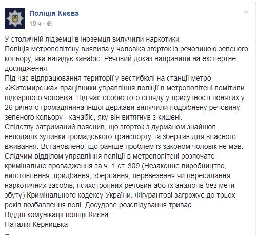 В метро Киева у иностранца изъяли наркотики, предположительно, каннабис. Об этом на своей странице в Facebook пишет отдел коммуникаций полиции Киева.