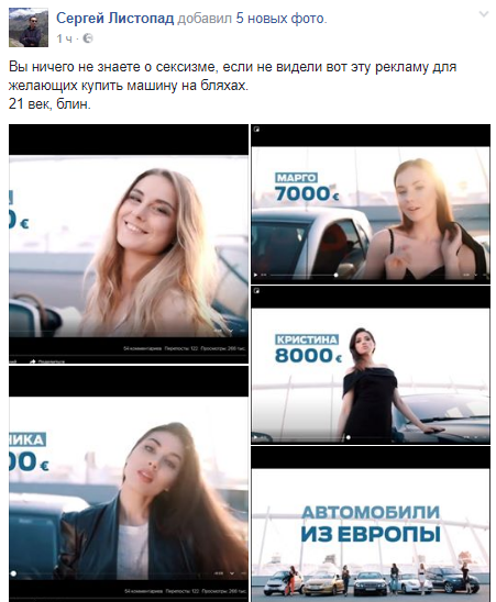 "Вы ничего не знаете о сексизме, если не видели вот эту рекламу для желающих купить машину на бляхах. 21 век, блин", - написал Сергей Листопад.