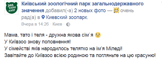 "Мама, папа и теленок - дружная семья:) В Киевзоо снова пополнение! В семействе яков родился теленок по имени Миледи! Посетите Киевзоо всей семьей и посмотрите на эту красавицу!", - говорится в сообщении.