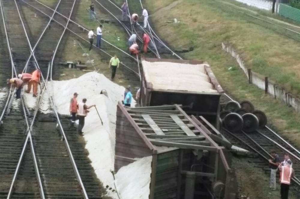 Неподалеку от железнодорожной станции грузовой поезд сошел с рельсов. В результате аварии один из вагонов перевернулся. На пути высыпался песок, который собирают работники железнодорожной станции с помощью лопат.
