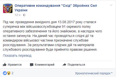 "Во время проведения выходного дня 13 августа произошла ссора между военнослужащим 91 отдельного полка оперативного обеспечения и его знакомой, в результате чего последняя погибла. В настоящее время проводятся следственные действия и командиром воинской части назначено служебное расследование", - говорится в сообщении.