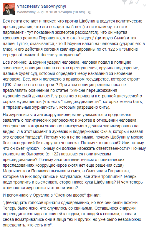 Вячеслав Садовничий, журналист: Вся лента стенает и плачет, что против Шабунина ведутся политические преследования, что его посадят на 5 лет (то ли в камеру, то ли в парламент - тут показания экспертов расходятся), что он жертва кровавого режима Порошенко, что это "пи**ец" (цитирую Сыча) и так далее. Гуглю, оказывается, что Шабунин напал на человека (ударил его в глаз), и его действия сегодня квалифицированы по ст. 122 УК "Умисне середньої тяжкості тілесне ушкодження".