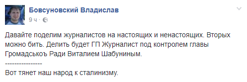 Владислав Бовсуновский, журналист: "Давайте поделим журналистов на настоящих и ненастоящих. Вторых можно бить. Делить будет ГП Журналист под контролем главы Громадськои Ради Виталием Шабуниным. Вот тянет наш народ к сталинизму".