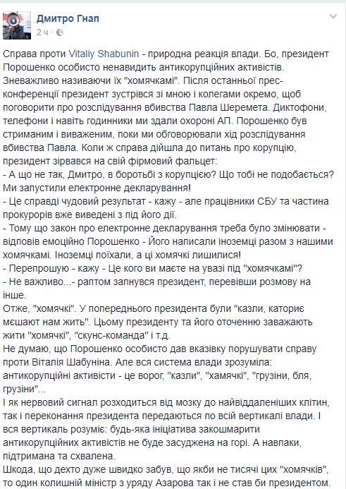 Гнап отмечает, что это не означает, что Порошенко лично дал указание возбуждать дело против Шабунина, но показывает его отношение к ним и это отношение передается его подчиненным.