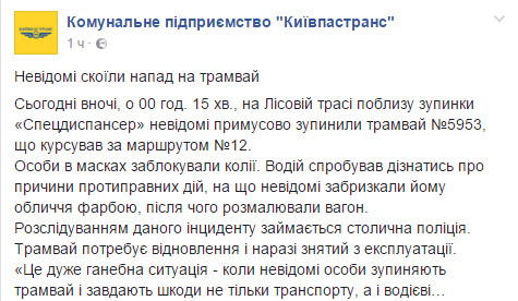 "Сегодня ночью в 0:15 на Лесной трассе возле остановки "Спецдиспансер" неизвестные принудительно остановили трамвай №5953, следовавший по маршруту №12", - сказано в нем.