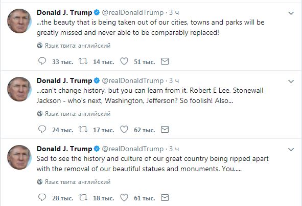 "Грустно видеть, как историю и культуру нашей страны разрывают сносы наших прекрасных статуй и памятников. Мы не можем изменить историю, но мы можем извлечь из нее уроки. Роберт Ли, Стоунуолл Джексон - кто следующий? Вашингтон? Джефферсон? Как глупо!" - написал он на своей странице в твиттере.