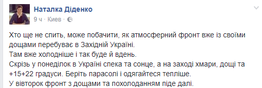 "Везде в понедельник в Украине жара и солнце, а на западе облака, дожди и +15 +22 градуса. Во вторник фронт с дождями и похолоданием пойдет дальше", - написала она.