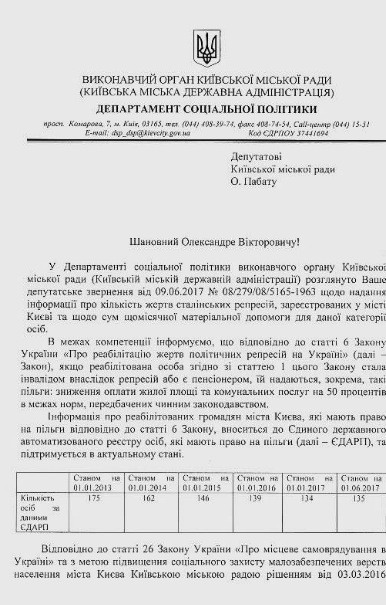 При этом депутат приложил фото ответа на его запрос из Департамента соцполитики КГГА,в котором отмечается, что из-за ограниченного финансирования и увеличения количества социально незащищенных граждан Киева (за счет участников АТО, их семей и лиц, которые принимали участие в массовых акциях протеста времен Майдана) в 2017 году единоразовые выплаты жертвам репрессий составят 250 гривен. В 2016 году сумма такой помощи была 300 гривен.
