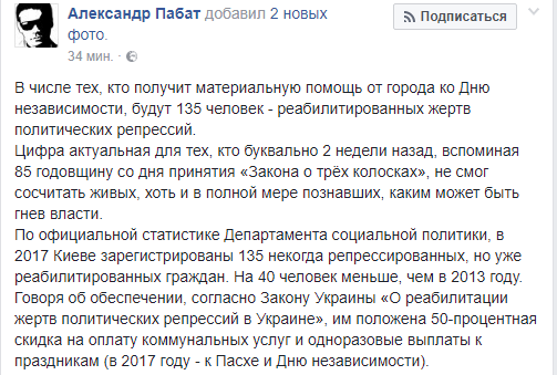 Депутат столичной мэрии Александр Пабат сообщил, что в 2017 году единоразовую помощь ко Дню независимости жертвам политических репрессий уменьшили с 300 до 250 гривен. Об этом он написал в Facebook.