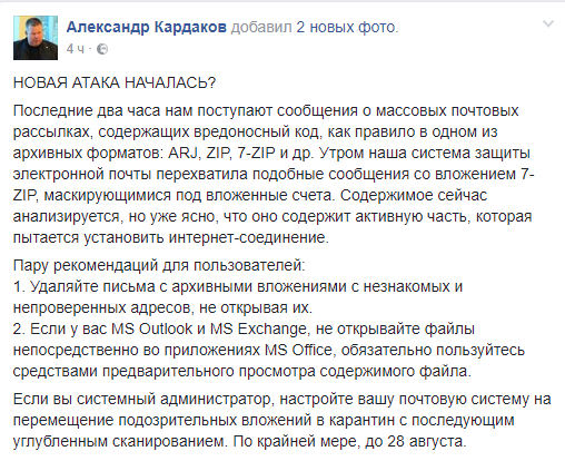 "Новая атака началась? Последние два часа нам поступают сообщения о массовых почтовых рассылках, содержащих вредоносный код, как правило в одном из архивных форматов: ARJ, ZIP, 7-ZIP и др. Утром наша система защиты электронной почты перехватила подобные сообщения со вложением 7-ZIP, маскирующимися под вложенные счета. Содержимое сейчас анализируется, но уже ясно, что оно содержит активную часть, которая пытается установить интернет-соединение", - пишет бизнесмен.