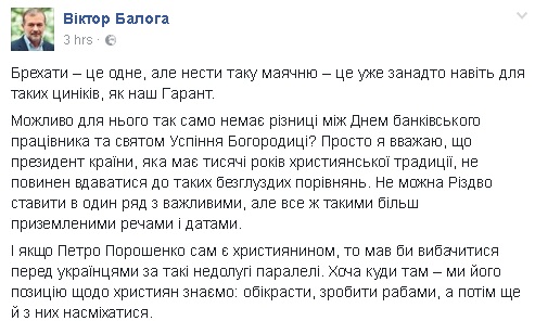 "Возможно для него так же нет разницы между Днем банковского работника и праздником Успения Богородицы? Просто я считаю, что президент страны, имеет тысячи лет христианской традиции, не должен прибегать к таким нелепым сравнений. Нельзя Рождество ставить в один ряд с важными, но все же такими более приземленными вещами и датами", - написал Балога.