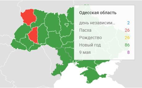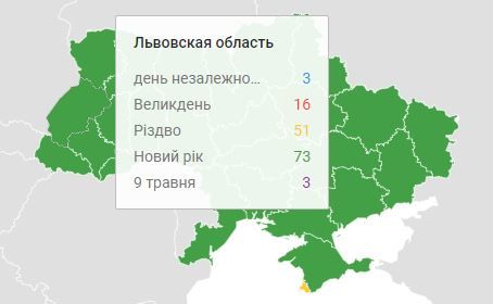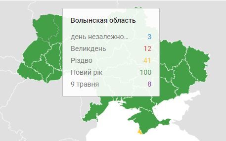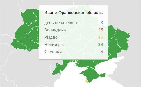 Мы сравнили популярность Дня независимости и перечисленных президентом праздников за 2016 год, добавив к общему списку 9 мая - День победы. В целом по Украине предпочтения разделились так: