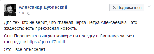 "Для тех, кто не верит, что главная черта Пётра Алексеевича - это жадность: есть прекрасная новость. Сын Порошенко выиграл конкурс на поездку в Сингапур за счет госсредств", - пишет журналист Александр Дубинский.