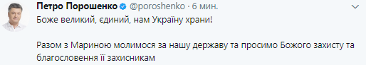 "Боже великий, единый, нам Украину храни! Вместе с Мариной молимся за нашу страну и просим Божьего защиты и благословения ее защитникам", - говорится в сообщении.
