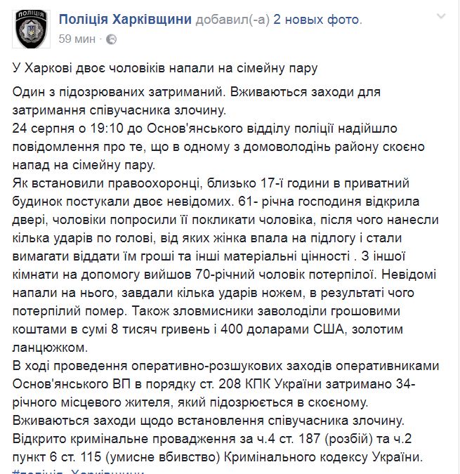 В Харькове грабители ворвались в дом пожилой супружеской пары и устроили резню. Об этом сообщает полиция Харьковской области на странице в Facebook.