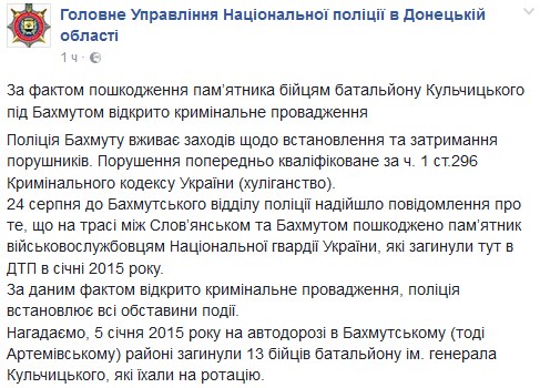 По факту повреждения памятника бойцам батальона Кульчицкого под Бахмутом открыто уголовное производство. Об этом сообщает пресс-служба ГУ НП в Донецкой области на своей странице в Facebook.