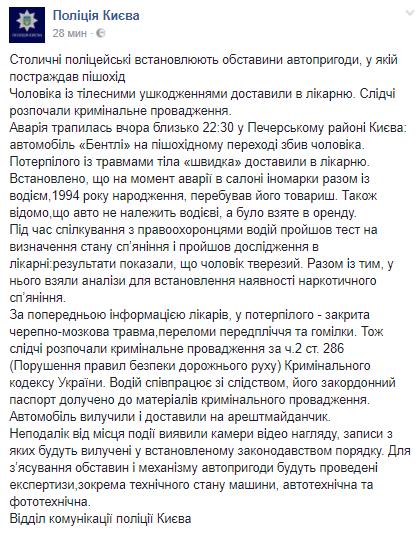 Напомним, что ДТП произошло вчера около 22.30 в Печерском районе Киева. Автомобиль Bentley на пешеходном переходе сбил мужчину.
