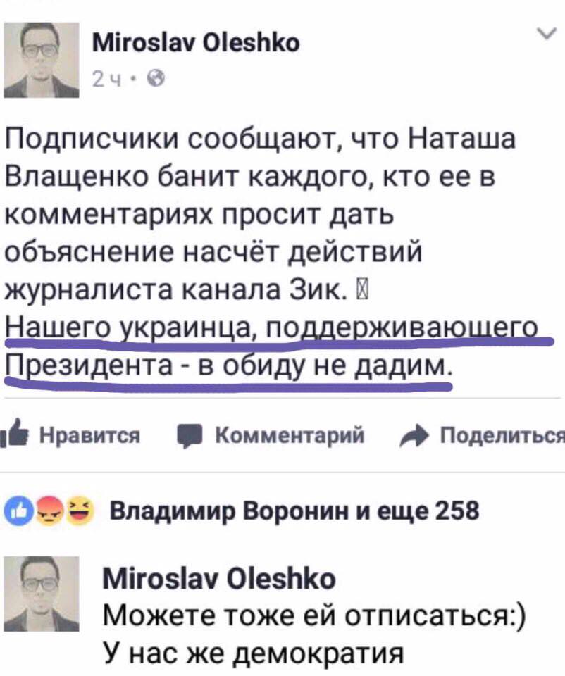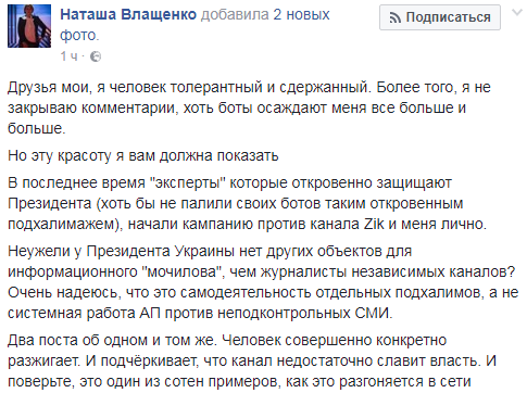 "В последнее время "эксперты" которые откровенно защищают президента (хоть бы не палили своих ботов таким откровенным подхалимажем), начали кампанию против канала Zik и меня лично", - заявила Влащенко.