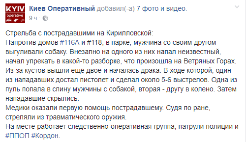 "В парке, мужчина со своим другом выгуливали собаку. Внезапно на одного из них напал неизвестный, начал упрекать в какой-то разборке, что произошла на Ветряных Горах. Из-за кустов вышли еще двое и началась драка. В ходе которой, один из нападавших достал пистолет и сделал около 5-6 выстрелов", - говорится в сообщении.