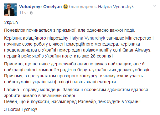 "Руководитель авиационного подразделения Мининфраструктуры Галина Винарчук покидает министерство и начинает свою работу в качестве коммерческого менеджера, руководителя представительства в Украине авиакомпании номер один в мире Qatar Airways, первый рейс которой из Украины полетит уже 28 августа!" – написал он.