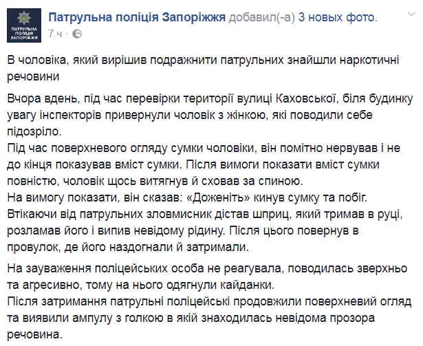 Убегая от полицейских, житель Запорожья выпил наркотик из шприца