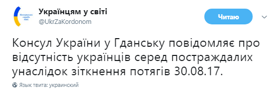 "Консул Украины в Гданьске сообщает об отсутствии украинцев среди пострадавших в результате столкновения поездов 30.08.17", - говорится в сообщении.