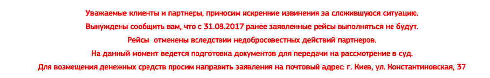 "Уважаемые клиенты и партнеры, проносим искренние извинения за сложившуюся ситуацию. Вынуждены сообщить вам, что с 31.08.2017 ранее заявленные рейсы выполняться не будут. Рейсы отменены вследствии недобросовестных действий партнеров. На данный момент ведется подготовка документов для передачи на рассмотрение в суд. Для возмещения денежных средств просим направить заявления на почтовый адрес: г. Киев, ул. Константиновская, 37. Сейчас решается вопрос о том, что рейс полетит чтобы забрать туристов и Тенерифе и Аликанте. " - сообщается на странице компании.