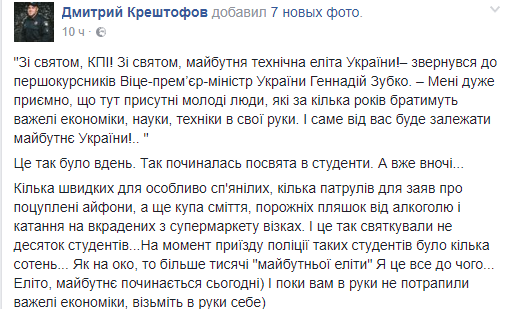 "С праздником, КПИ! С праздником, будущая техническая элита Украины, - обратился к первокурсникам вице-премьер-министр Украины Геннадий Зубко. - Мне очень приятно, что здесь присутствуют молодые люди, которые через несколько лет будут рычагом экономики, науки, техники. И именно от вас будет зависеть будущее Украины", - процитировал вначале полицейский поздравление вице-премьера.