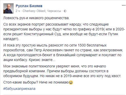 И пока эту простую мысль разносят по сети 1500 бесплатных порохоботов, сам Петр Алексеевич ганяет по стране, как электровеник. А когда проголодается-бежит в ближайший супермаркет и покупает по акции колбасу. Кризис знаете...", - пишет Бизяев.