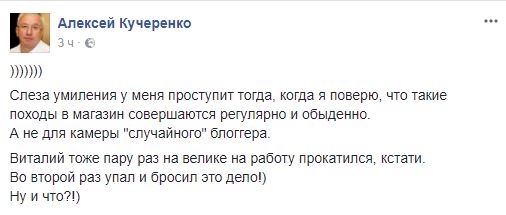 "Слеза умиления у меня проступит тогда, когда я поверю, что такие походы в магазин совершаются регулярно и обыденно. А не для камеры "случайного" блоггера", - иронизирует бывший министр ЖКХ Алексей Кучеренко.