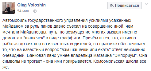 "Но возмущение многих вызвал именно демонтаж "шашечек" в виде граффити. Причём и тех, кто, активно работая до сих пор на известных водителей, на практике обеспечивает то, что на известный вопрос "вам шашечки или ехать" ответ неизменно очевидный. Банковая явно умнее владельца магазина "Эмпориум". Она символы не трогает - она ими прикрывается. Комсомольская школа все же", - прокомментировал он.