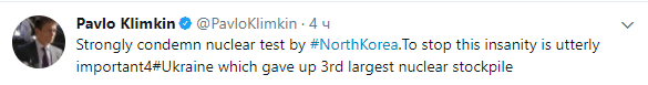 "Решительно осуждаю ядерное испытание Северной Кореи. Остановить это безумие чрезвычайно важно для Украины, которая отказалась от третьего по величине ядерного запаса", – написал Климкин.